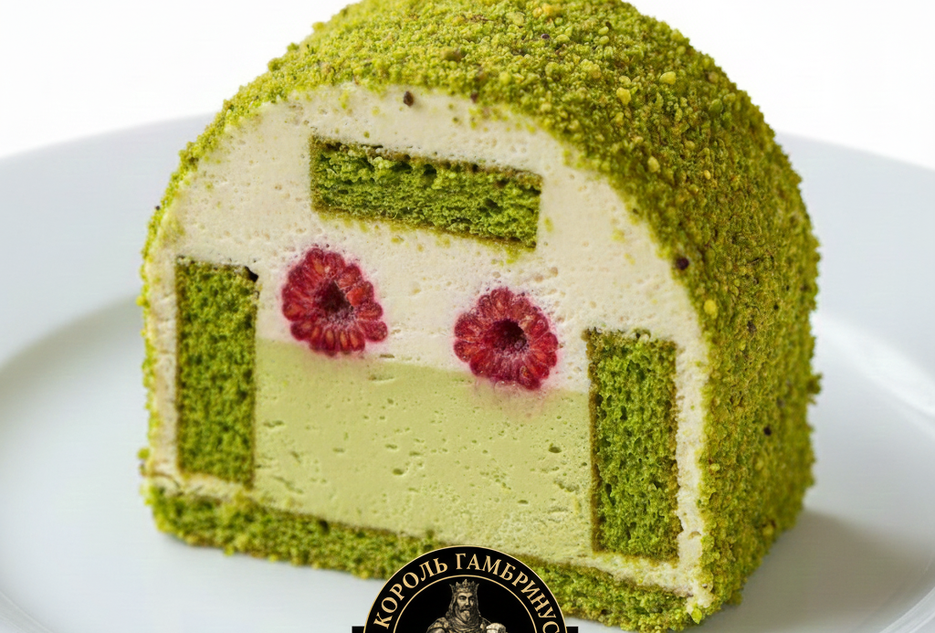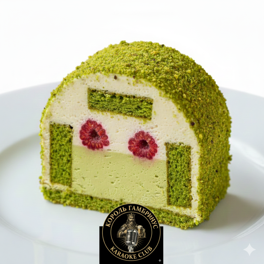 Яркий фисташковый бисквит, сливочный крем с белым шоколадом, крем-ганаш с натуральной фисташковой пастой, и спелая малина.